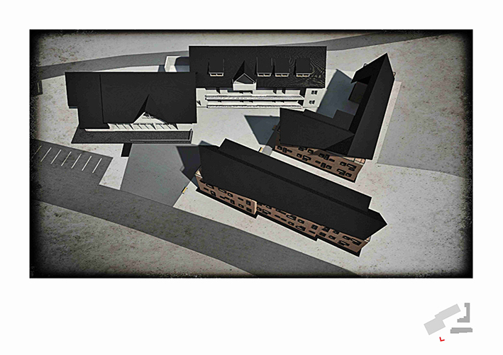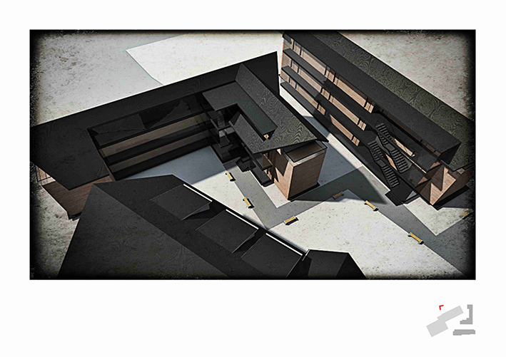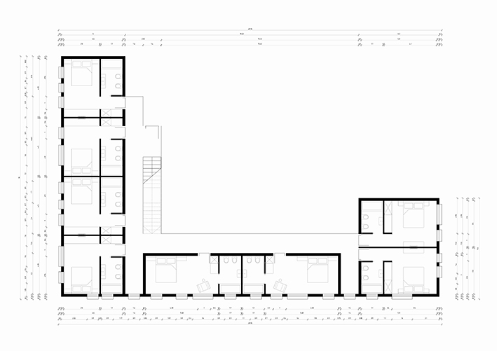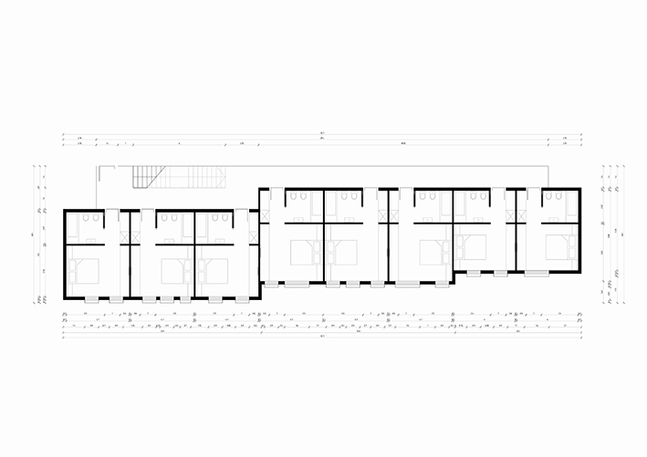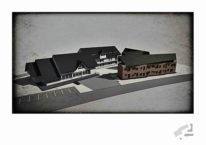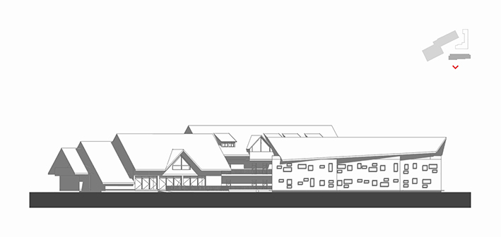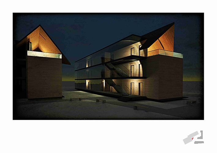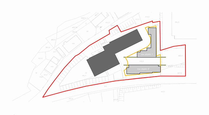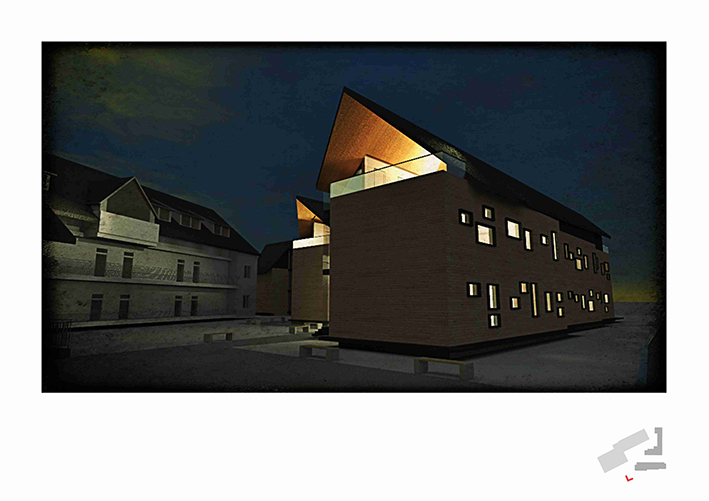 The dynamic arrangement of the window openings is upgraded with diagonal notches on the roof, which especially at night create a decorative pattern on the facade. The swimming pool along with the spa center are located in the basement area.
