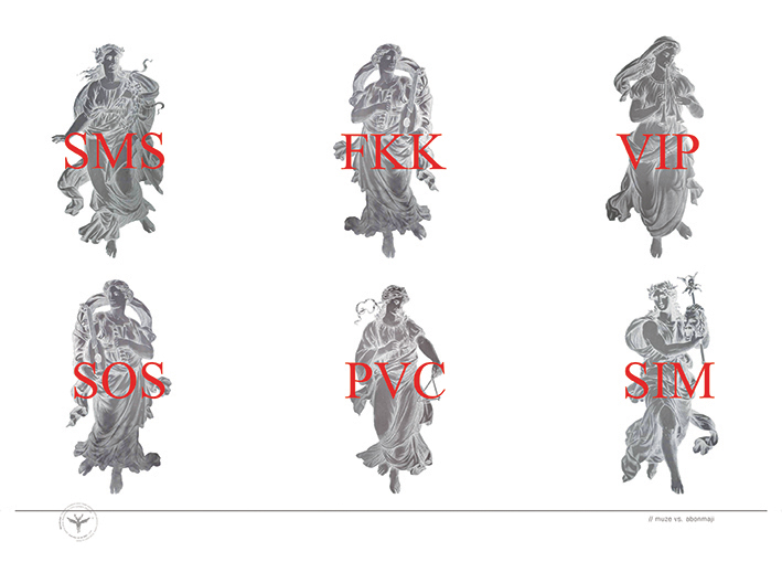 The muses are taken from the etched entrance doors of the Slovenian Philharmonic, names (VIP, SMS, FKK, SOS, PVC, SIM) are existing names of Philharmonics subscriptions.