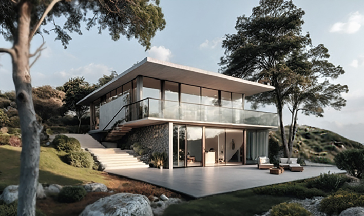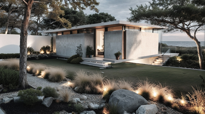 Its character comes from the careful balance between private, sheltered spaces and large glass openings that connect the interior with the surrounding seascape.